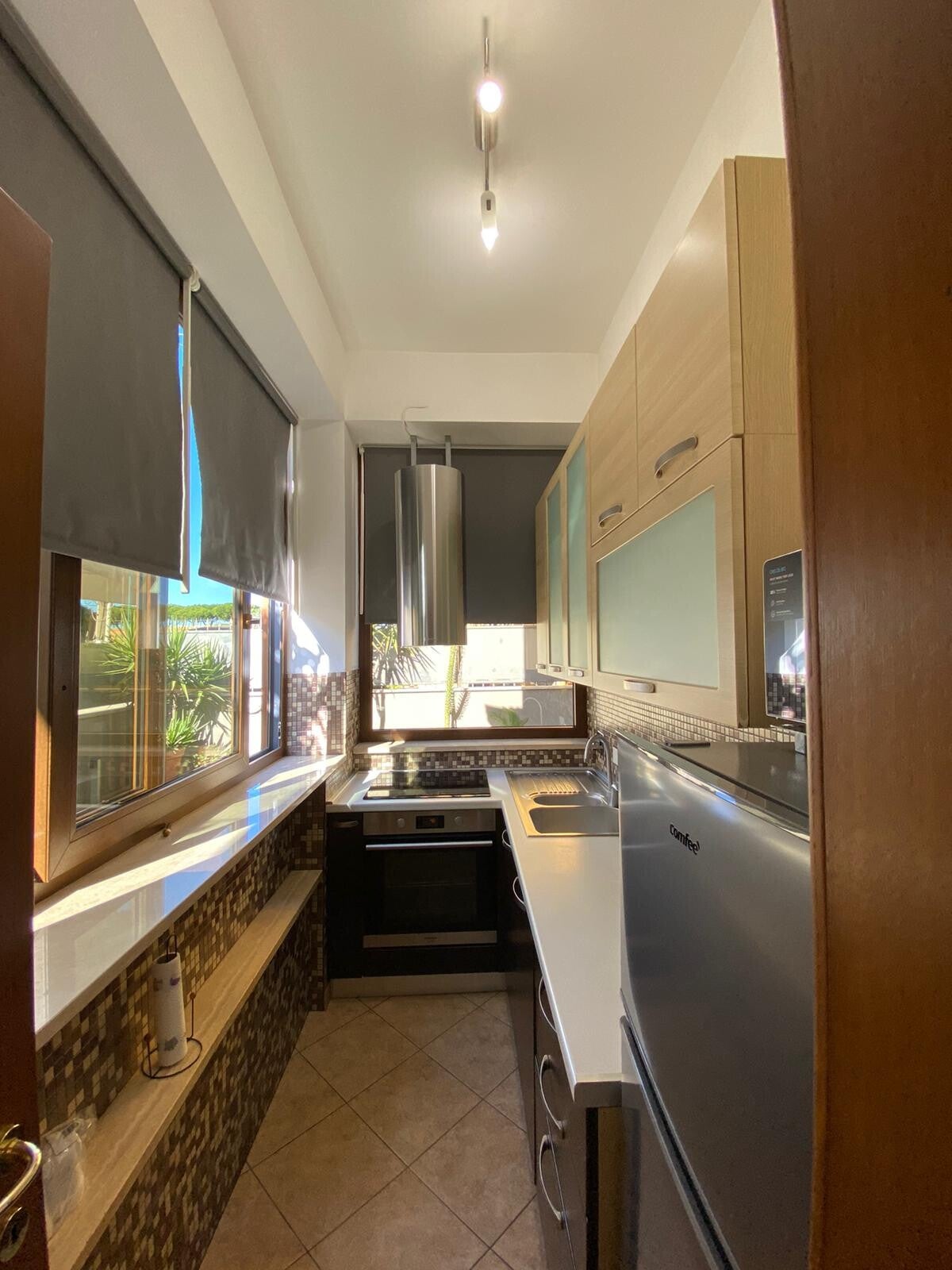 La casa vacanze comprende 2 camere da letto, un soggiorno con divano letto, una cucina attrezzata con frigorifero e macchina da caffè, e 1 bagno con bidet, doccia e wc. Inoltre, troverete asciugamani, lenzuola, lavatrice, estintore, Wi-Fi gratuito, riscaldamento e aria condizionata.