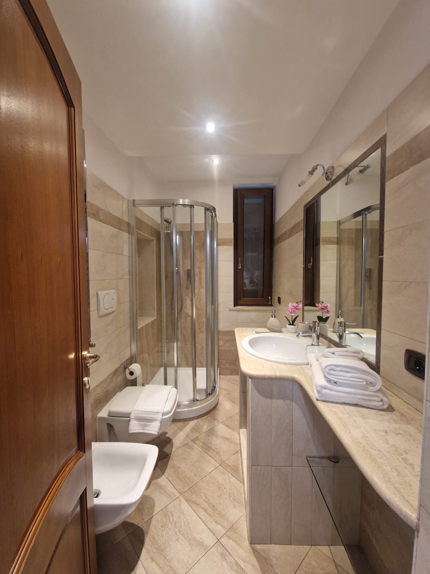 Il bagno dispone di una doccia, bidet, wc, asciugamani, asciugacapelli, carta igienica e bagno doccia.