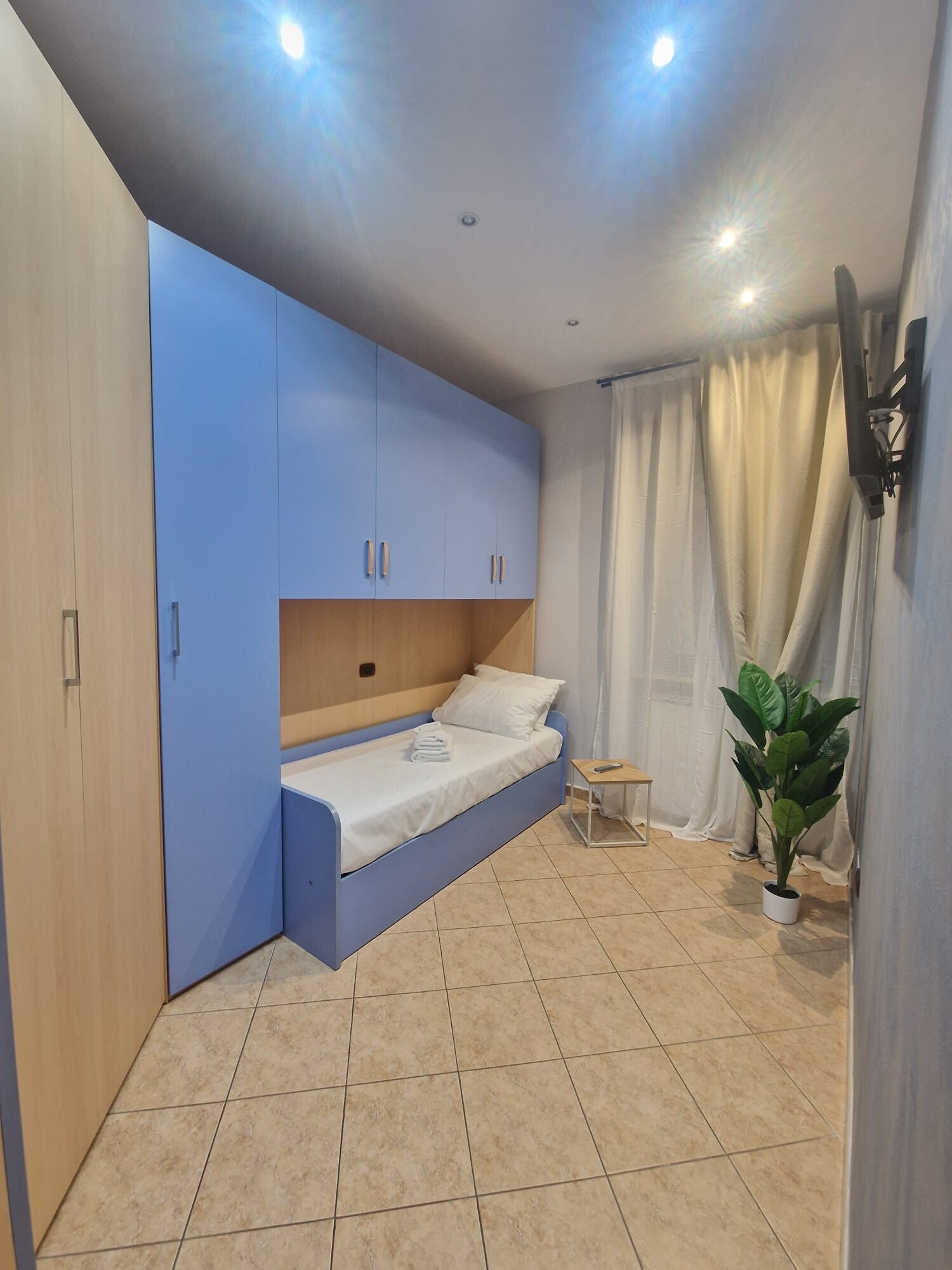La camera da letto offre un letto singolo e un letto a scomparsa, prese vicino al letto, TV smart a schermo piatto e lenzuola pulite.